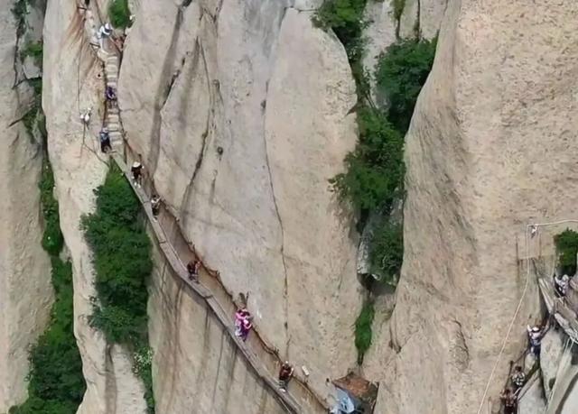栈谈高下王人是陡壁绝壁,铁索横悬,仅由尺许宽的条石搭成路面,下由石柱固定。游东谈主至此,需面壁贴腹,屏气挪步,每一步都仿佛行走在生与死的角落,被誉为“华山第一天阻”。