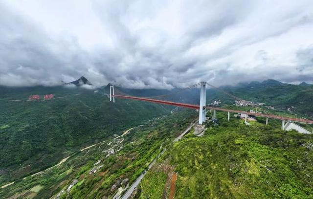 坝陵河大桥,横跨贵州黔西地区的坝陵河大峡谷,是沪瑞国谈上的一座钢铁巨龙。主跨1088米,桥面至水面高达370米,是当今国内第一、宇宙第六的大跨径钢桁梁悬索桥,代表着贵州桥梁培育的最高时间水准。