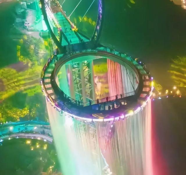 在500米的高空,环形悬廊上装配的灯光水瀑系统,化作总周长达168米的大型环形音乐瀑布。日间,它如“飞流直下三千尺”般壮不雅;夜晚,流光溢彩,仿佛踏进于科幻与推行交汇的黑甜乡之中,带来前所未有的感官冲击。