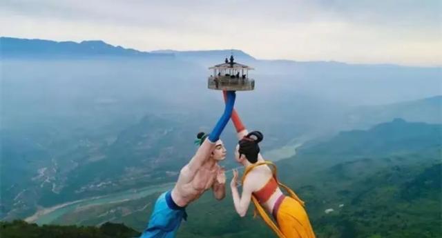 武隆白马山天尺情缘景区,与青娥山隔江相望,崖高千尺,绝壁悬空。这里以白龙马与青衣青娥的爱情传闻为魂,承载着中华传统文化的骨血深情。