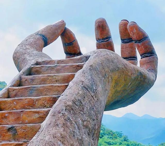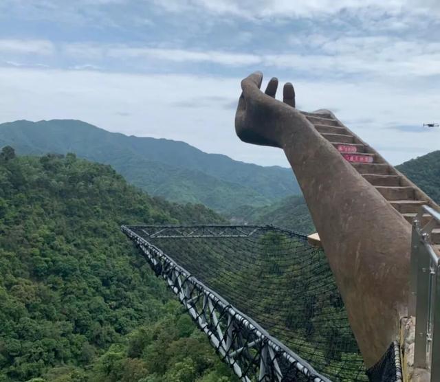 巨手亦如一朵洞开的莲花,能容纳两三东谈主伫立。站在上头,俯视幽邃峡谷,四周群山绿树环绕,龙潭虎穴,那种颠簸的视觉体验,仿佛让你蓦的脱离了地心引力,在云端与神灵对视。