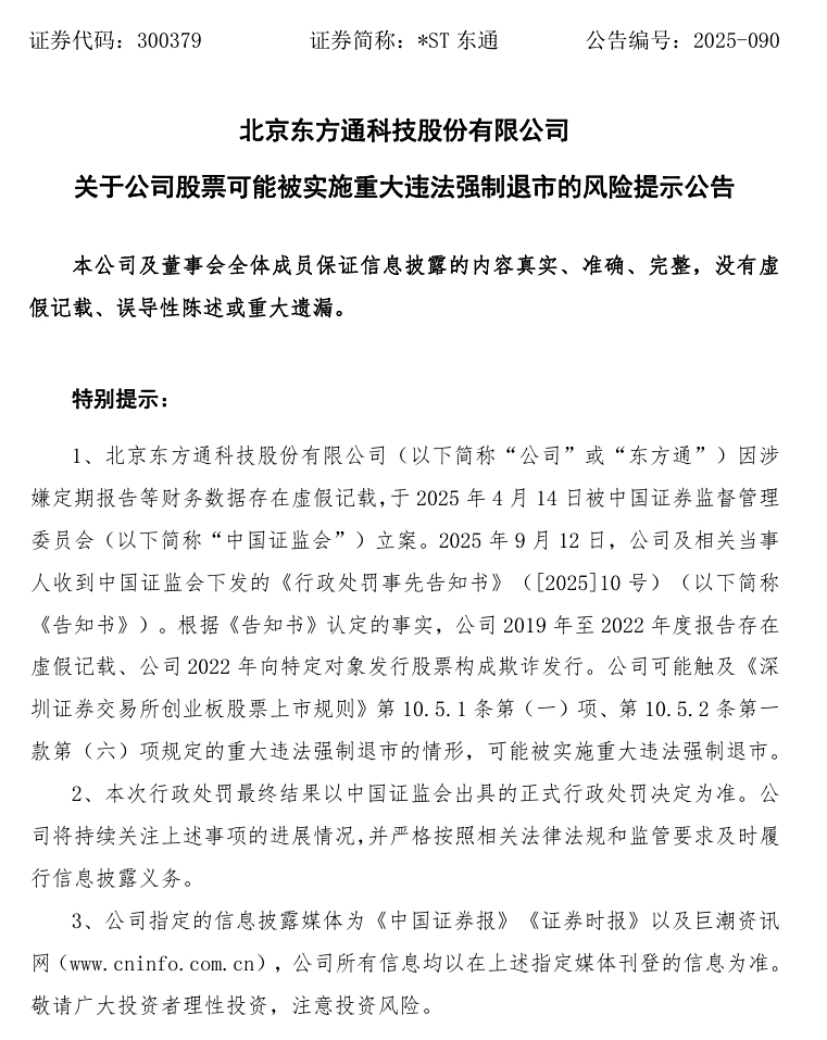 IT之家 9 月 12 日音书,据证监会网站本日音书,近日,证监会对深交所创业板上市公司北京东方通科技股份有限公司(简称 * ST 东通)涉嫌依期讲述等财务数据存在失实纪录作出行政处罚事前示知。