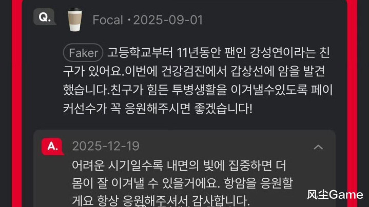 Faker为患癌粉丝打气