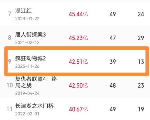 2025年12月6日,《荒诞动物城2》提名2026评述家收受奖最好动画片;12月8日,该片提名第83届金球奖最好动画长片、电影和票房竖立奖。收尾1月5日晚,猫眼电影专科版数据泄露,《荒诞动物城2》上映41天,累计票房超42.51亿元(含预售),反超2019年4月24日在中国大陆上映的《复仇者定约4:末端之战》的累计票房,成为入口片票房新王者,也成为中国影史票房第九名。而字据猫眼和灯塔两个平台的展望,《荒诞动物城2》的总票房区分是43.32亿元和43.22亿元,思要挑战中国影史票房第八名《唐东说念主街探案3》的45.23亿元票房已基本烦恼。