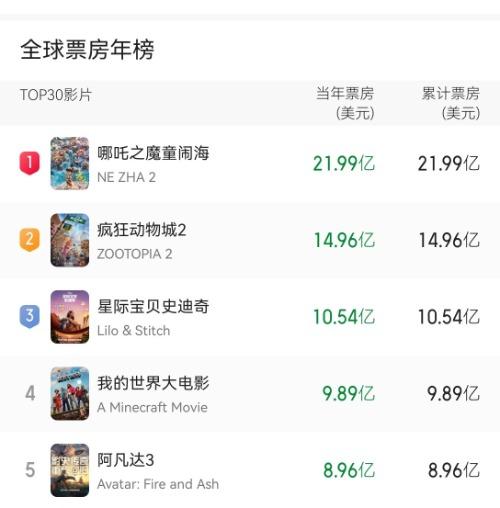 不外凭借中国市集超6亿好意思元的超等阐发,《荒诞动物城2》成为2025年人人票房亚军,而2025年人人票房前两名齐是动画电影:《哪吒之魔童闹海》、《荒诞动物城2》。如若算上真东说念主动画《星际宝贝史迪奇》和《我的寰宇大电影》,2025年人人票房前四名,齐是动画电影。不事后两部电影在中国大陆票房独一1.81亿元和2.12亿元。