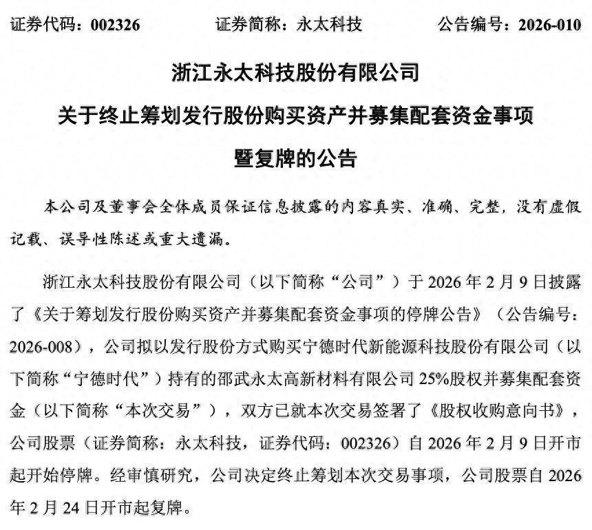 2月13日,永太科技(002326)公告,公司原拟以刊行股份容貌购买宁德时间抓有的邵武永太高新材料有限公司25%股权并召募配套资金。鉴于后续各计算方未能就交易决议达成一问候见,抽象接洽公司推行情况及外部身分,经审慎评估并与计算方充分疏浚,公司决定间隔贪图本次交易事项,本次间隔不会对公司的坐褥运筹帷幄酿成紧要不利影响。公司股票自2月24日开市起复牌。