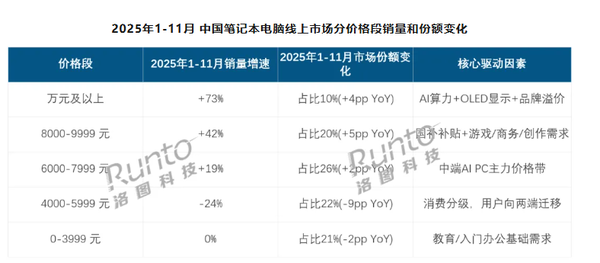 其中,游戏本进展尤为亮眼。2025年前11个月,游戏本线上销量同比增长17%,远高于8%的合座市集增速,8000至9999元价钱段占据37%份额,万元以上的高端游戏本销量更激增81%。联念念系以37%的市占指导跑,机械编削凭借聚焦电竞策略斩获近20%份额。轻浮本受益于出动办公与AI画图功能普及kaiyun官方网app下载,销量同比增长4%;商务本则稳步占据近60%销量,但增幅仅为2%,正加快向AI集成与高效低耗标的演进。